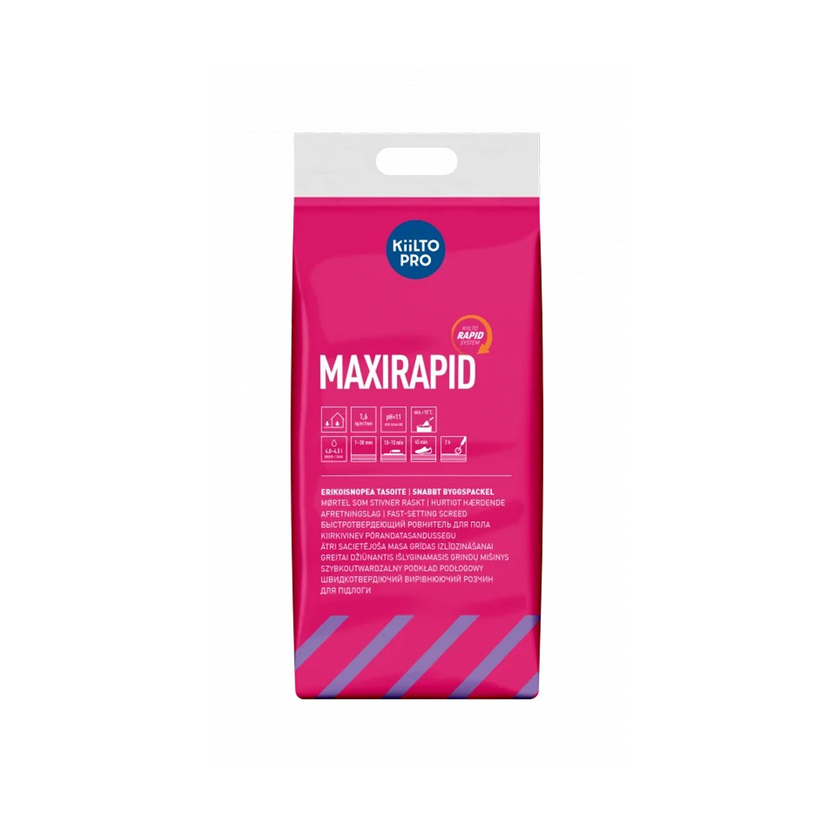 Atnaujintos sudėties labai greito stingimo grindų remontinis mišinys vidaus ir lauko darbams. Darbinis laikas 10 – 15 min. Džiūvimo laikas 2 val. Galima vaikščioti po 45 min. Kietumas C 40. Elastingumas F 10. Išeiga: 1,6 kg/m2/mm. Frakcija: maks.